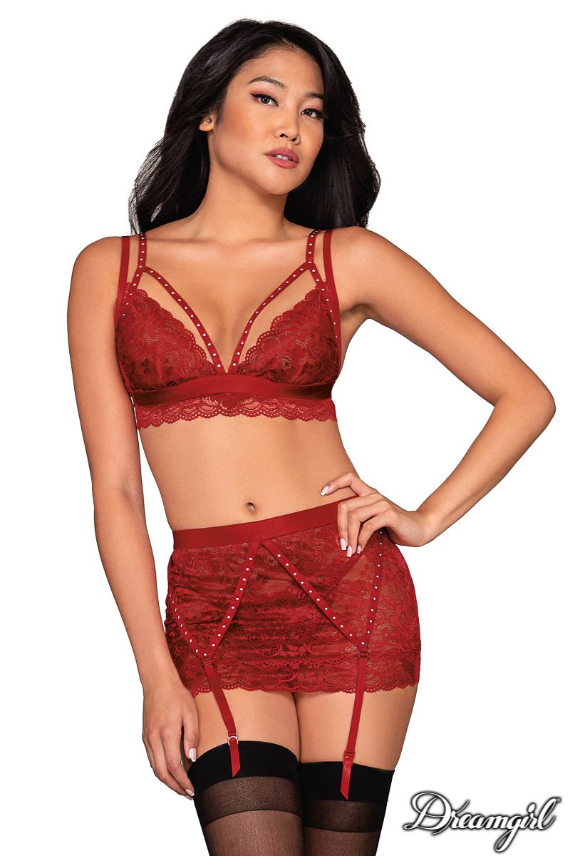 - High-waisted lace skirt with studded adjustable garters and a silky elastic waistband