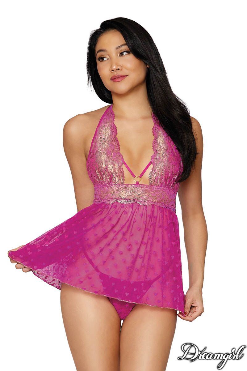 Sheer heart mesh babydoll featuring a flyaway open back, high metallic gold foil stretch lace cups, elastics featuring a front heart ring and a halter tie-neck closure (Matching G-string with triple gold heart ring back)