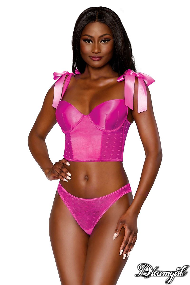 - Stretch satin longline bra with sheer heart-patterned mesh sides, underwired push-up cups, adjustable removable tie-up ribbon straps and a row of hook & eye back closures