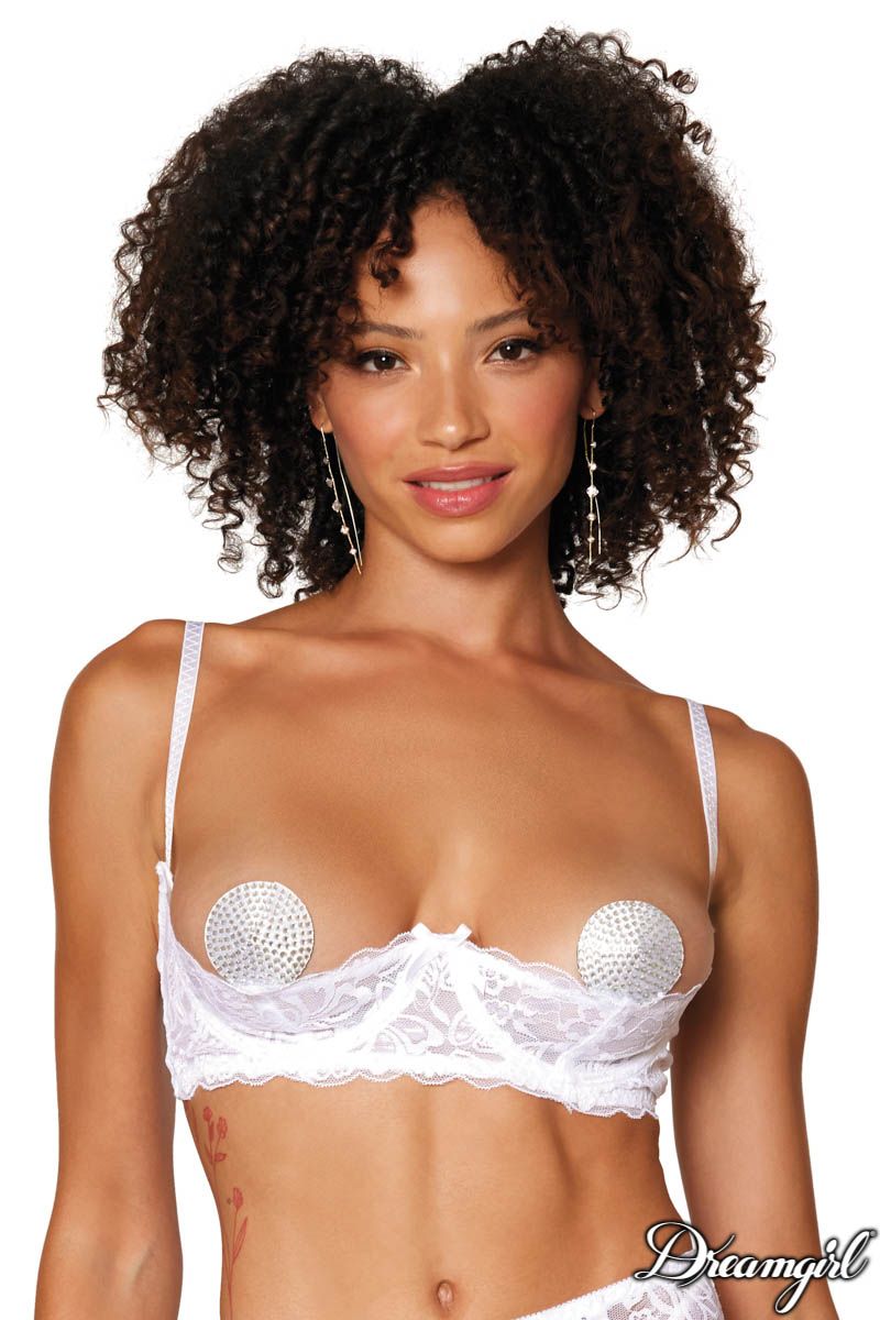 Stretch lace open cup underwire shelf bra with adjustable shoulder straps and hook & eye back closure.