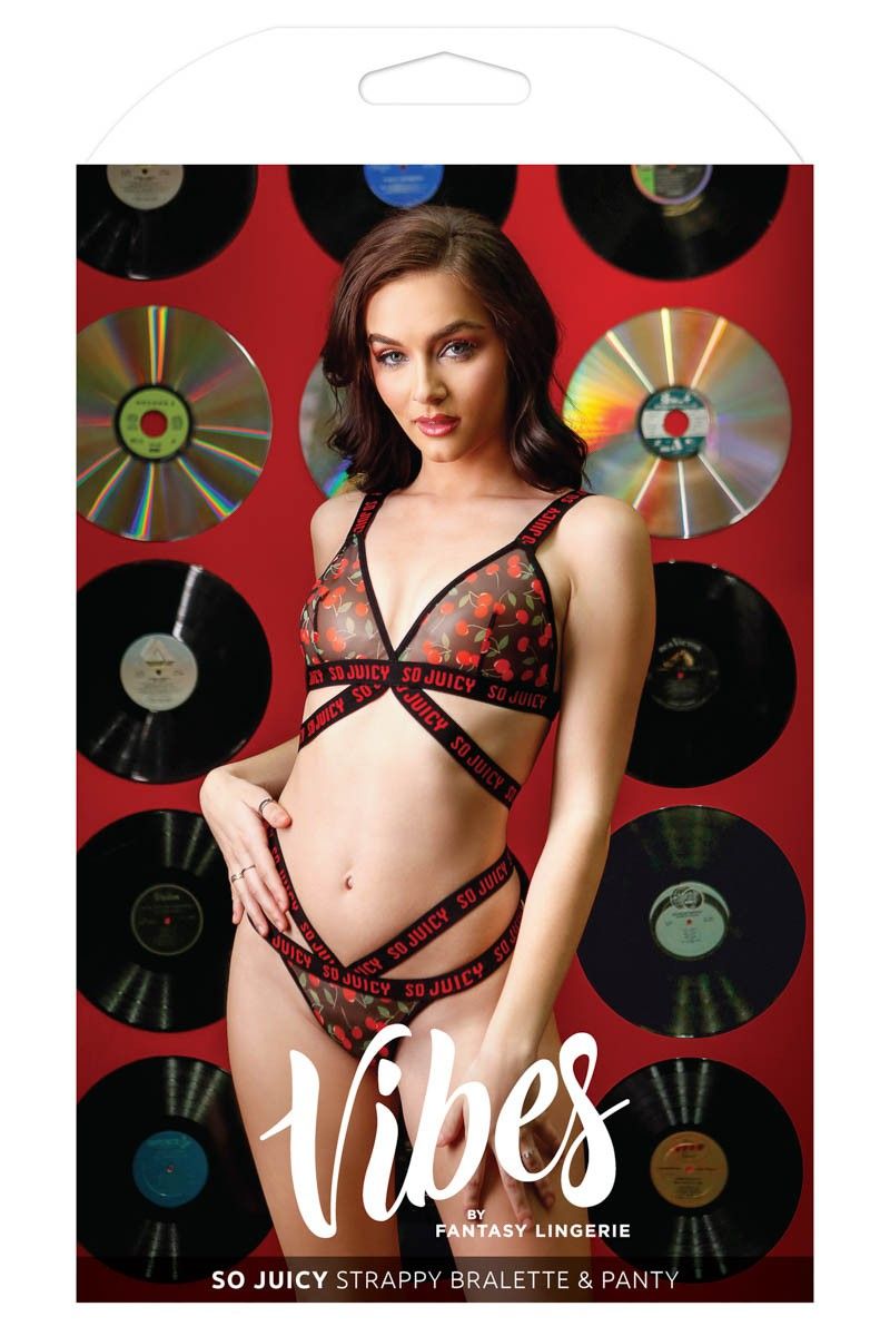- Cherry print mesh bralette with thick adjustable elastic straps featuring a "SO JUICY" print, a double elastic underbust and 2 hook & eye back closures