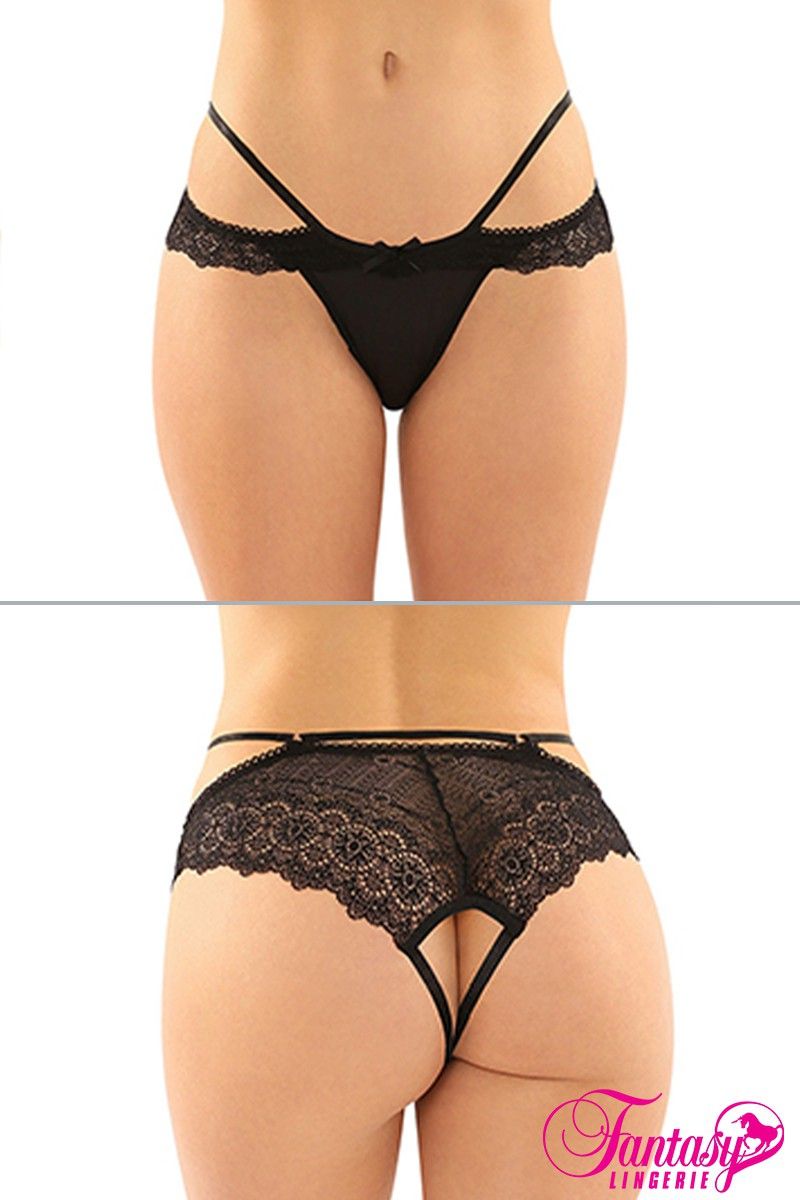 Low-waisted panty with a strappy cutout waistband, a full lace back, a lined cotton gusset and an open crotch