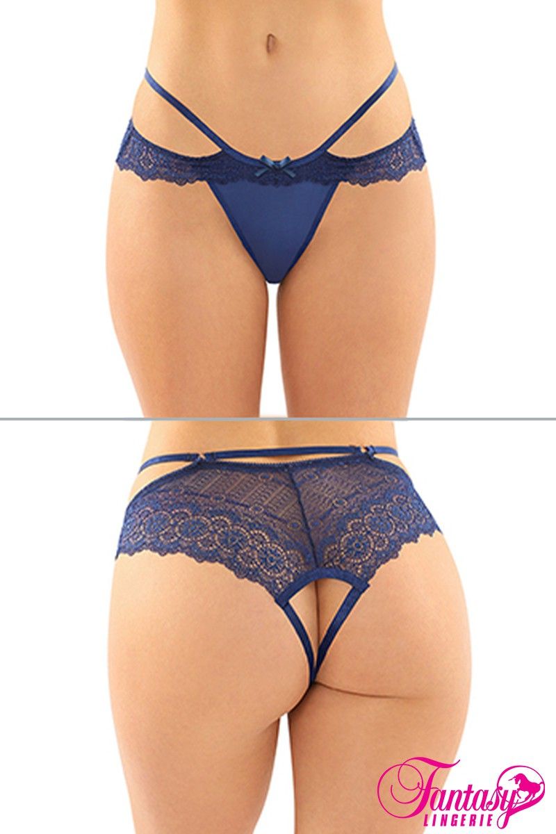 Low-waisted panty with a strappy cutout waistband, a full lace back, a lined cotton gusset and an open crotch