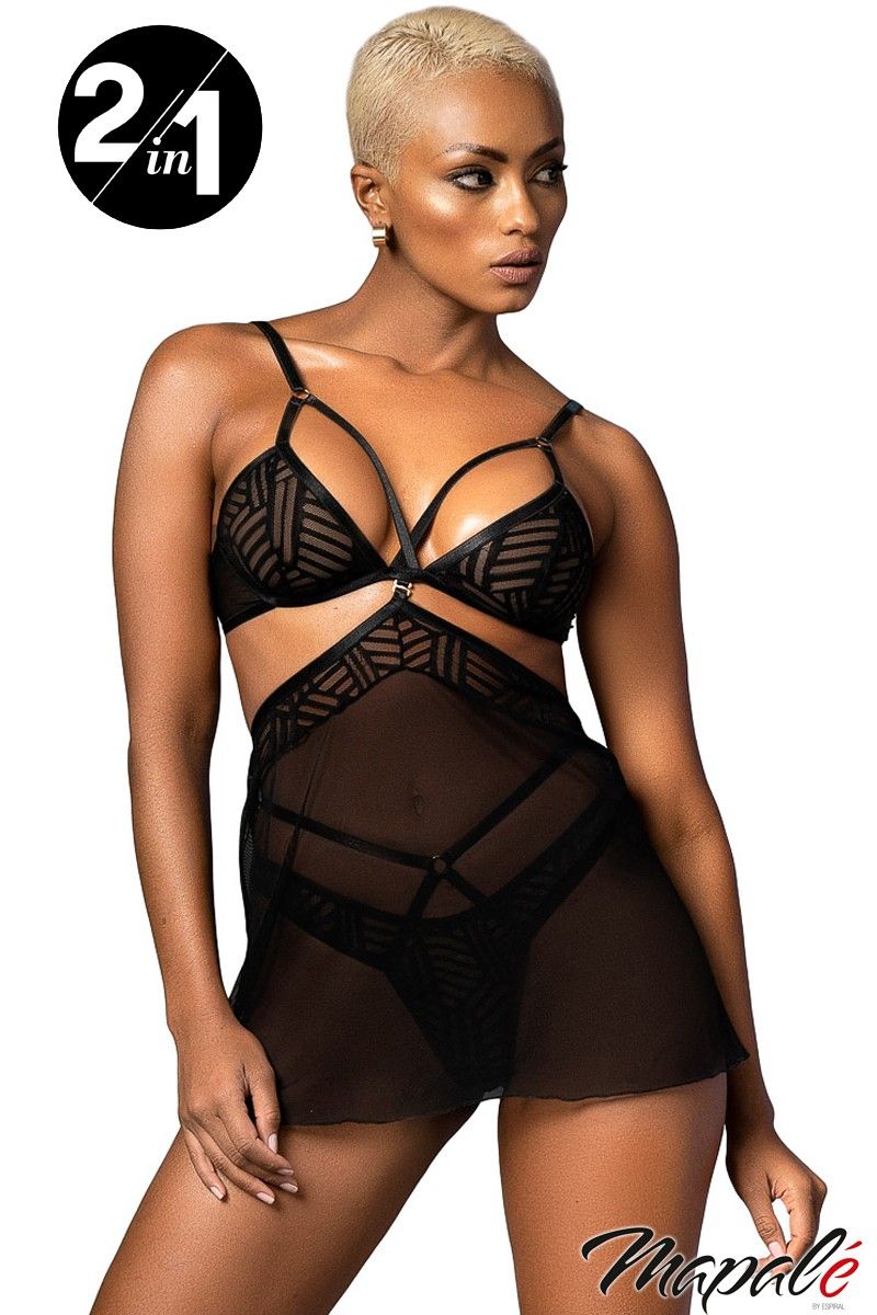 - Sheer soft mesh skirt with a thick striped waistband and a hook at the top to attach/detach from the bra to create a babydoll look