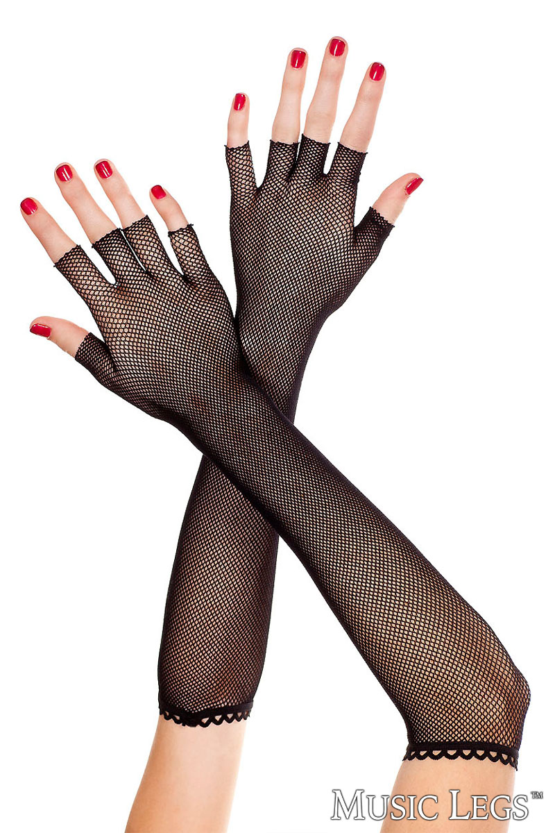 Fingerless fishnet ebow length gloves.