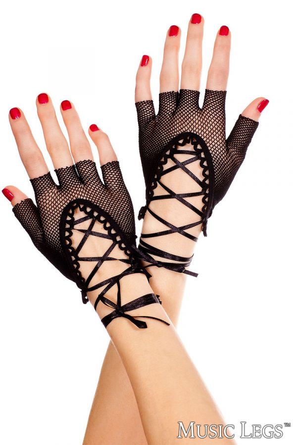 Lace up wrist length fishnet fingerless gloves
