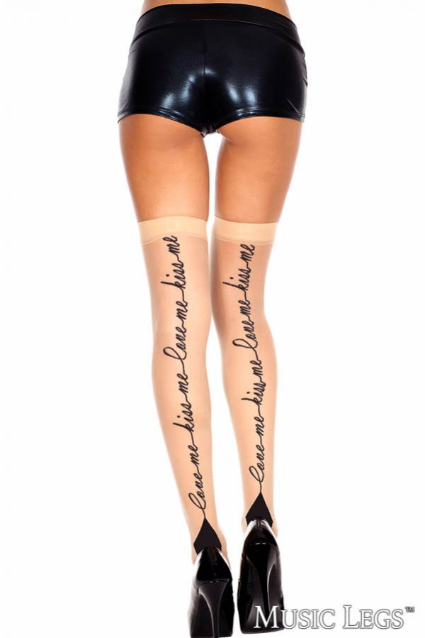 Sheer stretch thigh high stockings with a cursive "Love me kiss me" print forming a backseam, a cuban heel design and a thick opaque top