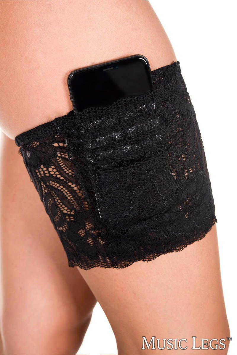 Stretch lace leg garter with silicone grip & 2 secret pockets to fit a large phone, keys, red lips…