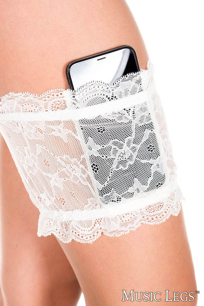 Stretch lace leg garter with silicone grip & 2 secret pockets to fit a large phone, keys, red lips…