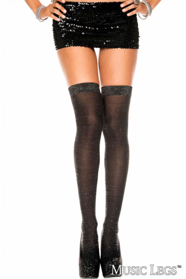 Lurex thigh high stockings with a glittery metallic silver shimmer and a thick opaque top