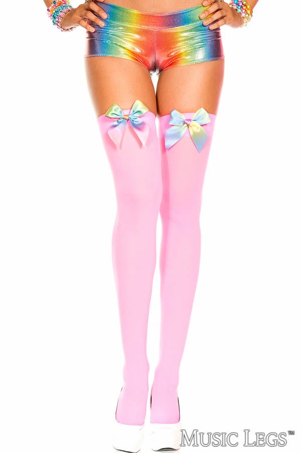 Opaque thigh high stockings with a rainbow gradient satin bow on the thick opaque band