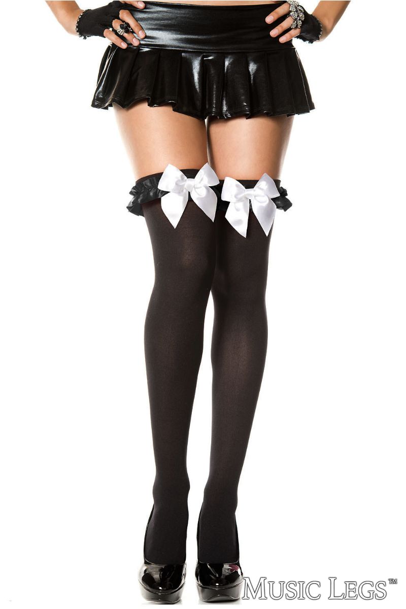 Opaque thigh high stockings with a ruffled top topped by a satin bow