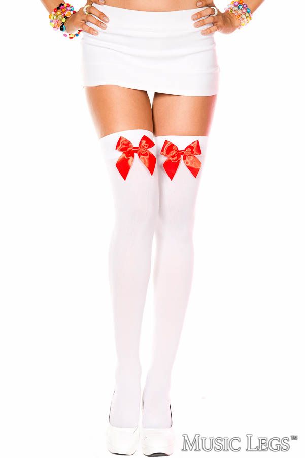 Opaque thigh high stockings with a satin bow on the thick opaque band