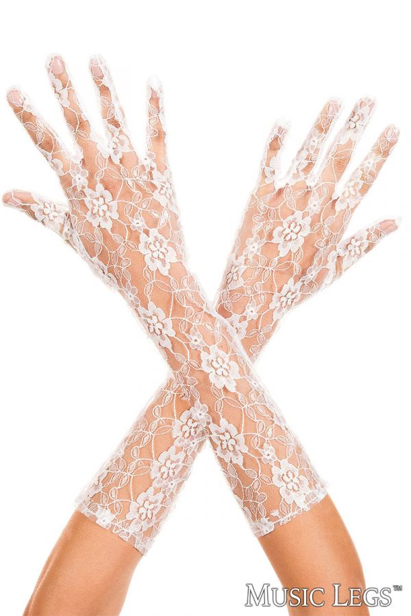 Elbow-length stretch lace gloves featuring delicate floral embroideries.