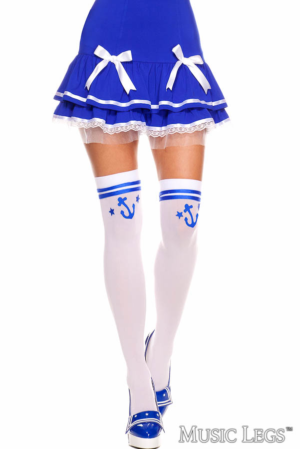 Opaque acrylic thigh high stockings with a double striped top and a sailor style anchor print