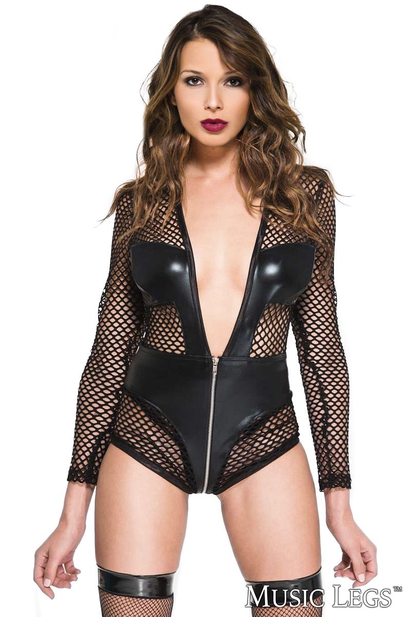 Long-sleeved fishnet teddy with a very low plunging neckline, glossy wet look insets and a front-to-back functional zipper.