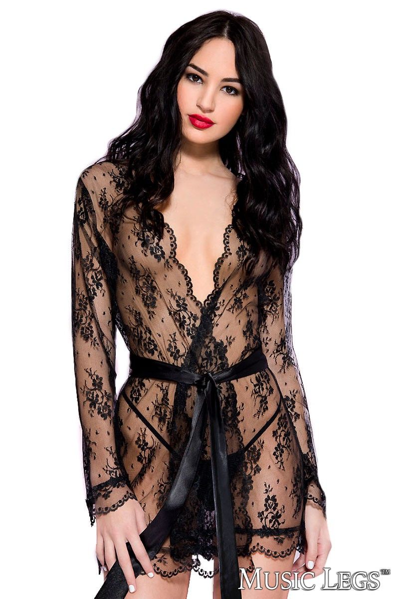 Long-sleeved sheer mesh robe featuring delicate floral lace embroideries all-over, a scalloped lace trim and a glossy satin self-tie belt. (G-String not included)