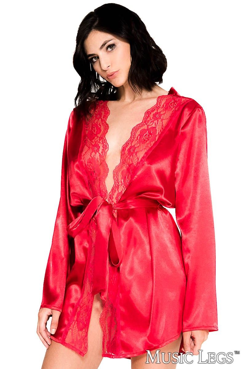 Long-sleeved satin robe with a scalloped lace trim and a matching satin belt (Panty not included)