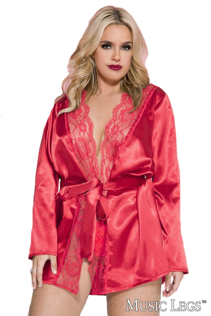 Long-sleeved satin robe with a scalloped lace trim and a matching satin belt (Panty not included)