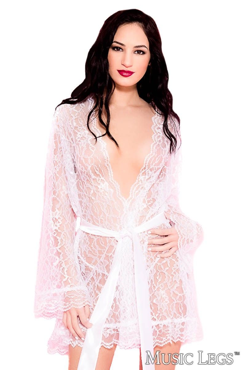 Long-sleeved floral lace robe with a scalloped trim and a matching satin belt (Panty not included)