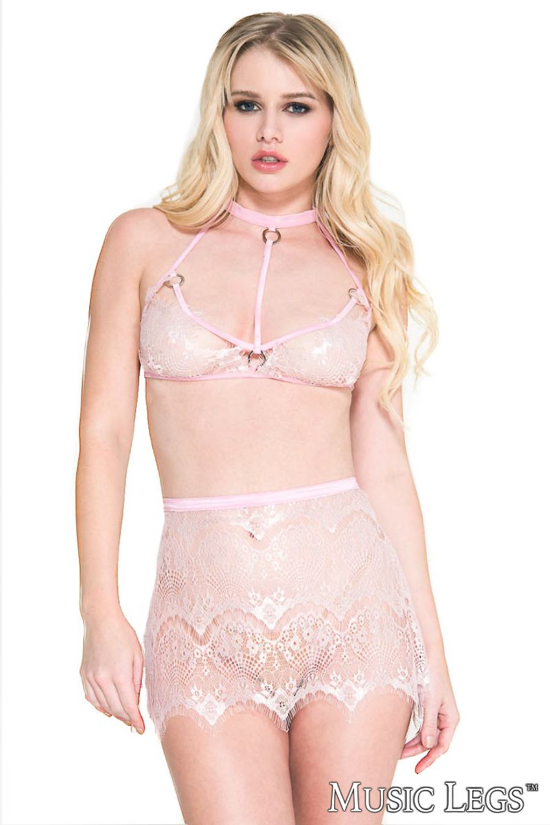 - Eyelash lace bralette with silver rings, three neckline straps tied to the attached choker and a tie-back closure