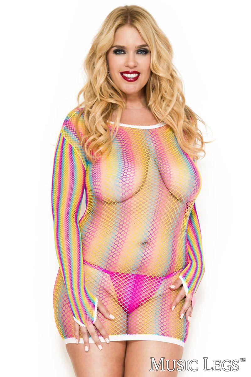 Long-sleeved rainbow fishnet mini dress with a thin opaque trim. (G-string not included.)