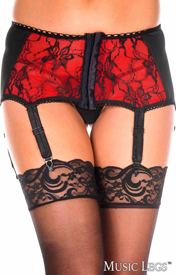 Spandex lace front garterbelt with hook an eye on front and boning on the sides with a mesh thong. (Stocking not included)