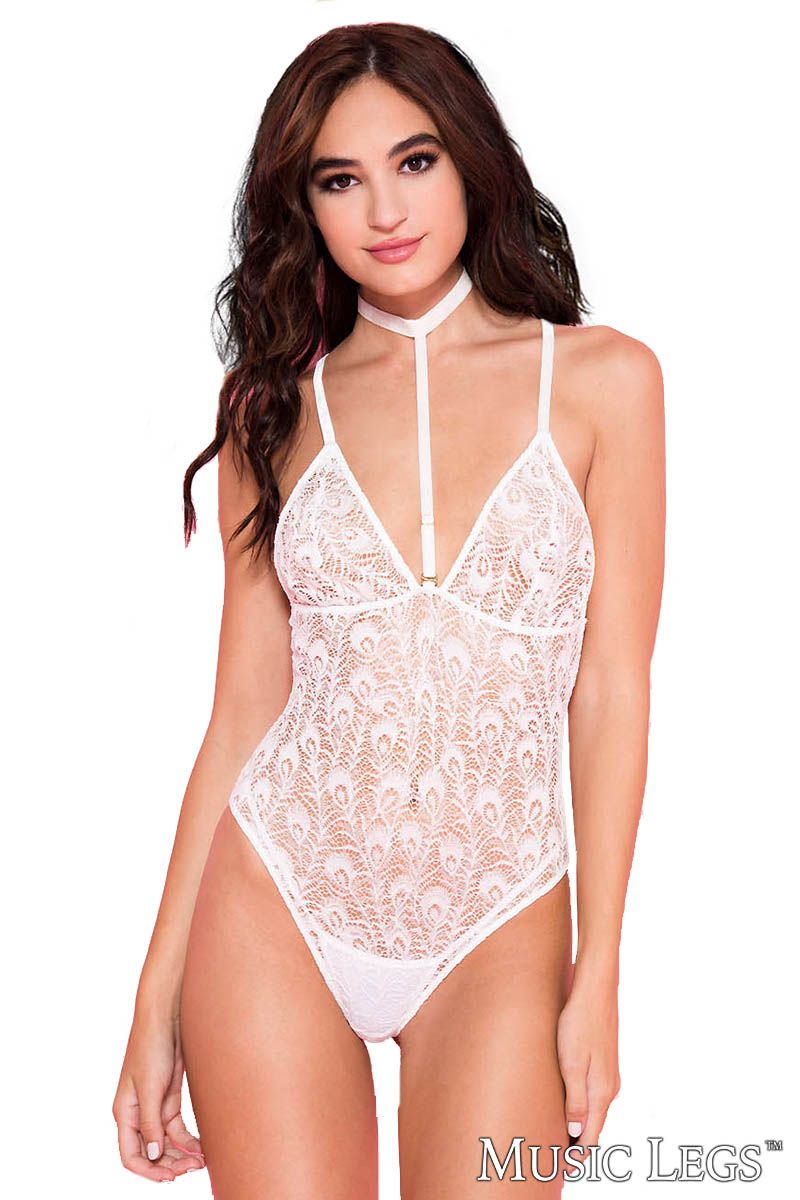 Stretch lace teddy featuring a peacock feather pattern, a detachable & adjustable elastic velvet collar with a hook closure, adjustable velvet straps crossed over a very low back and a thong-cut bottom with cotton gusset.
