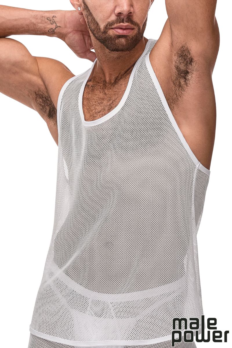 Breathable stretch fishnet tank top with racerback straps. ** Shown with assorted fishnet pouch short MP153-11C sold separately 85% Nylon - 15% Spandex